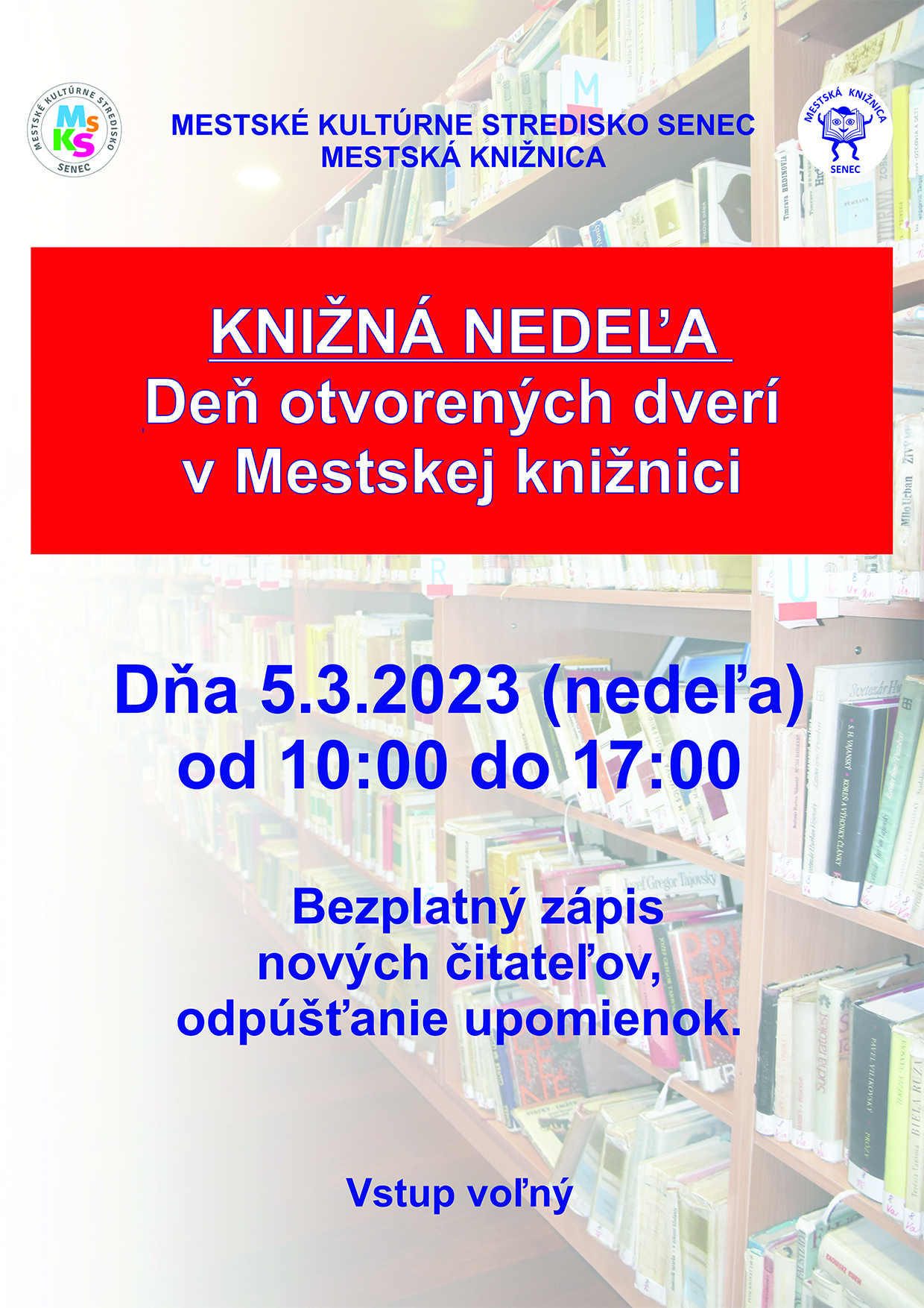Pozývame Vás na deň otvorených dverí v našej Mestskej knižnici v Senci dňa 05.03.2023. Nový čitatelia sa môžu v tento deň zapísať zadarmo. Upomienky Vám budú v tento deň odpustené.